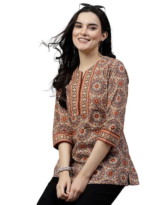 Women’s Ethnic Printed Rayon Short Kurta | Stylish Round Neck V-Slit Straight Kurti | Comfortable, Office & Casual Kurta for Jeans, Leggings & Trousers