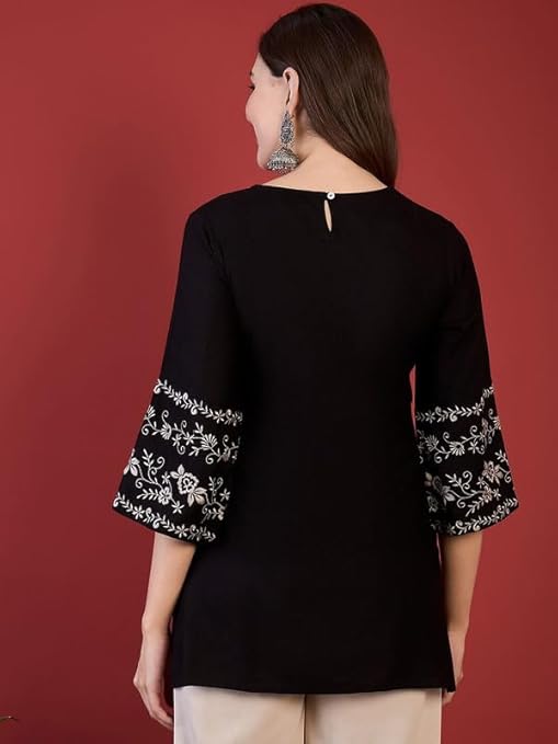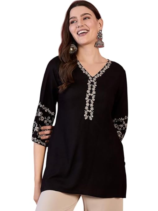 - ๐ Versatile Styling Options โ Pair this embroidered black kurti with leggings, palazzos, jeans, or trousers to create a modern Indo-western outfit for any event.